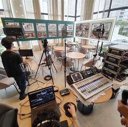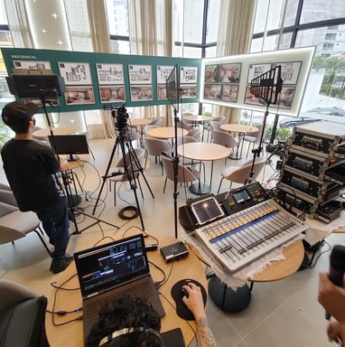 Estúdios para lives, plataforma webinar, sonorização de primeira qualidade, iluminação, projeção com painéis de Led, filmagem e muito mais.